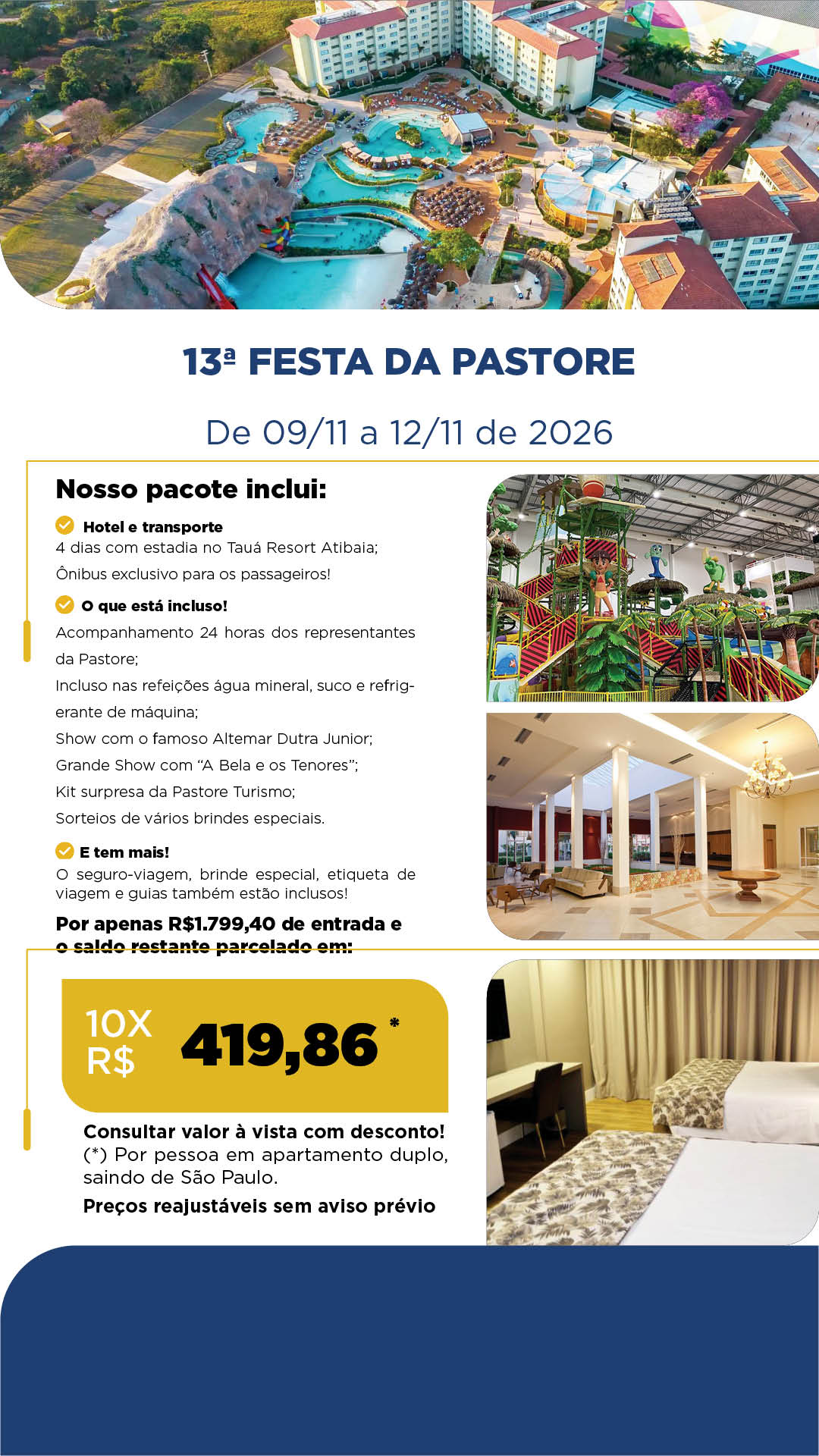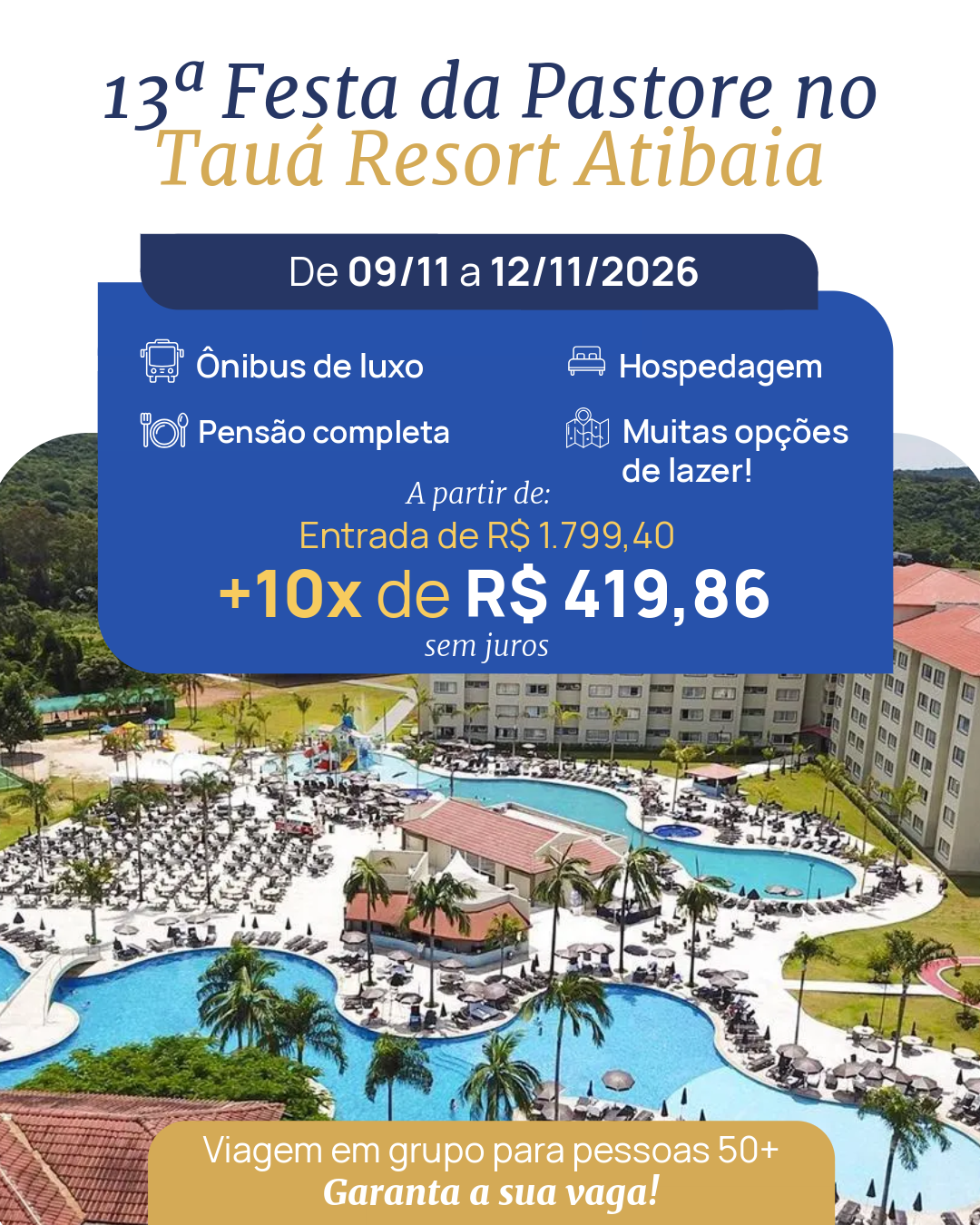 A Festa da Pastore é um encontro pensado para proporcionar conforto, segurança e muita diversão. Em um resort incrível, com ótima gastronomia e diversas opções de lazer, você viverá momentos inesquecíveis ao lado de um grupo 50+ cheio de alegria e novas conexões.