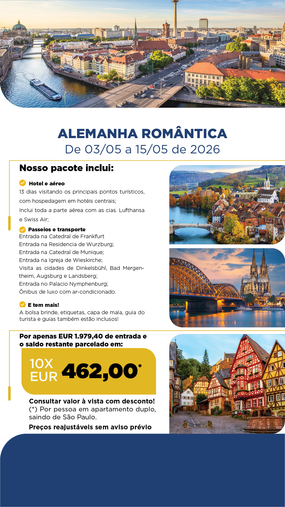 Nesta viagem incrível pela Alemanha, você contará com passagens aéreas com voos nos melhores horários, hospedagem em confortáveis hotéis 4 estrelas, café da manhã diário, traslados, passeios conforme o roteiro e acompanhamento de guia local falando português.