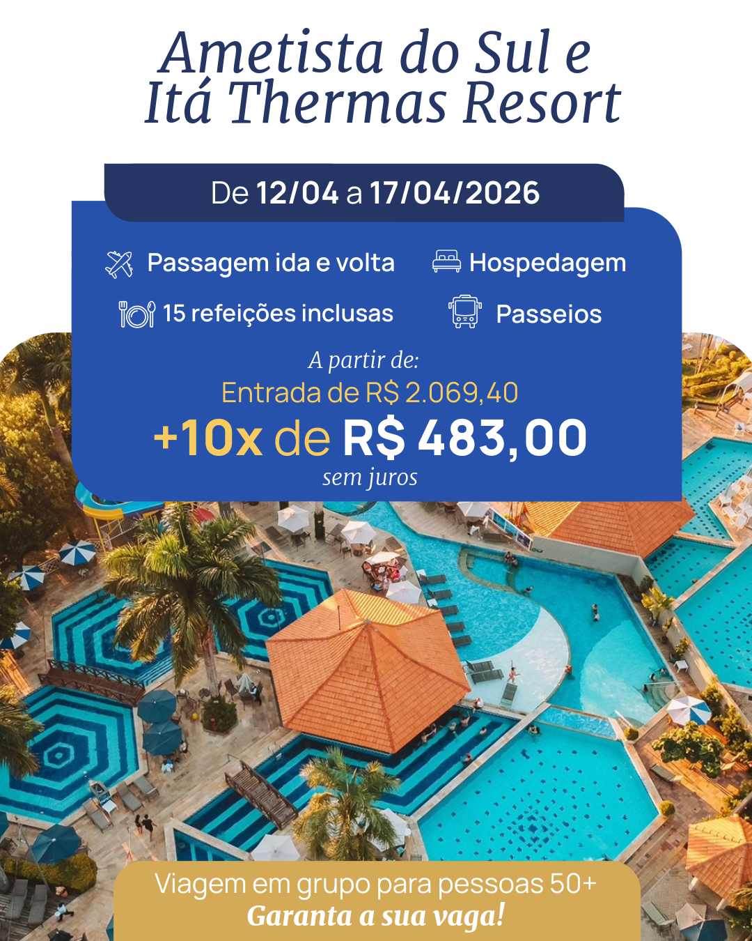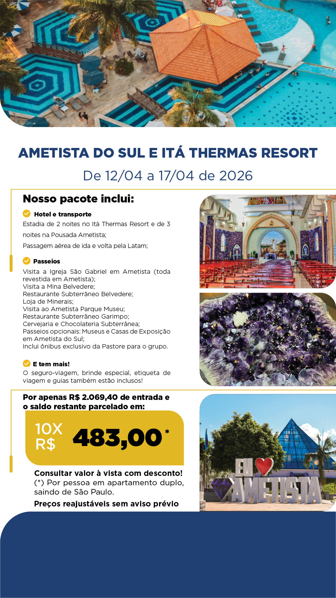 Serão 6 dias e 5 noites, sendo 4 dias e 3 noites em Ametista do Sul, com diversas refeições, e 3 dias e 2 noites no itá Thermas Resort, com pensão completa. O pacote está completo e já inclui passagem ida e volta para Chapecó, saindo de São Paulo, com a Latam. Já inclui transporte em ônibus exclusivo para o grupo, para todos os hotéis, aeroporto e passeios. Além de incluir diversos passeios como visita a Mina Belvedere, restaurante Subterrâneo Belvederee e muito mais!