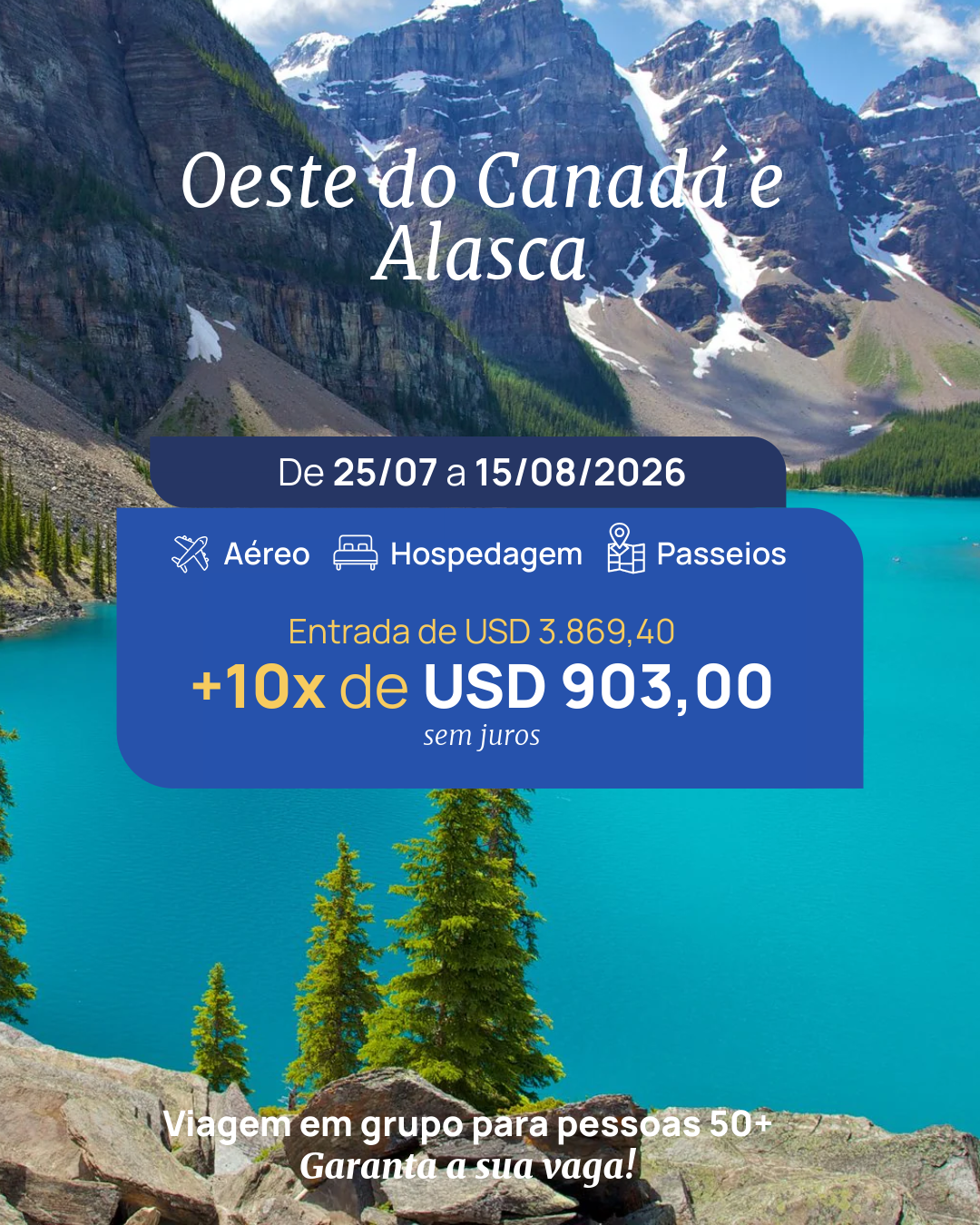 Serão 22 dias de viagem pelo Oeste do Canadá e pelo Alasca, percorrendo algumas das regiões mais impressionantes da América do Norte. No Canadá, o roteiro contempla cidades modernas como Vancouver, além de estradas cênicas, montanhas imponentes, lagos de águas cristalinas e parques nacionais, como as regiões das Montanhas Rochosas, com paisagens que parecem cartões-postais.