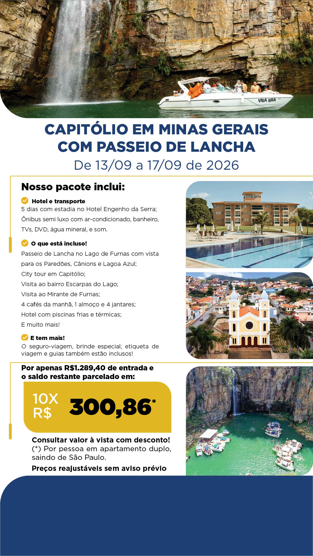 Venha aproveitar Capitólio e suas maravilhas no melhor hotel da região, com boas companhias e um passeio de lancha para apreciar as paisagens! Serão 5 dias aproveitando tudo que Capitólio tem a oferecer! Lagos de águas azul turquesa, cânions maravilhosos e muitas paisagens deslumbrantes, além de ficarmos hospedados no Hotel Engenho da Serra, que é considerado o melhor hotel da região, com várias opções de lazer, muitas atividades, café da manhã incluso e muito mais!!