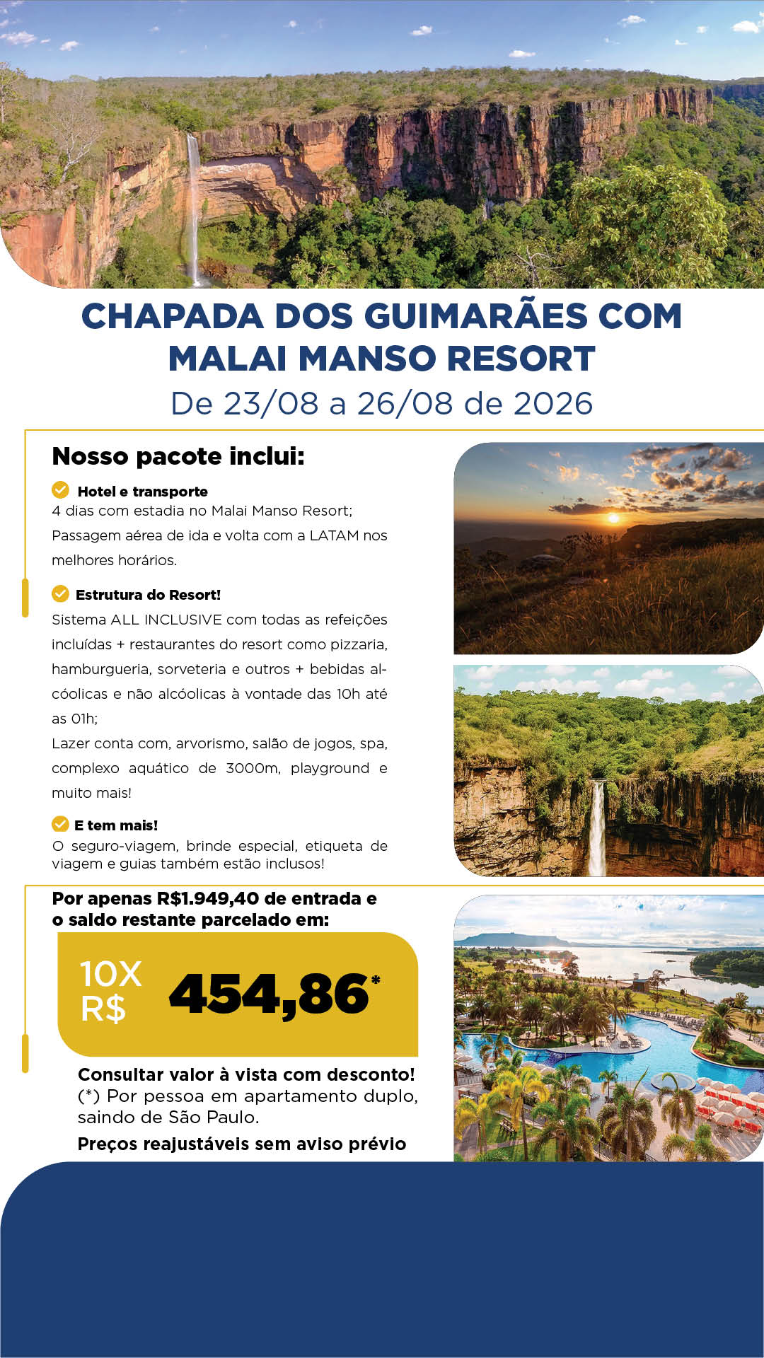 Serão 4 dias conhecendo o melhor da Chapada dos Guimarães com todo o conforto do Malai Manso Resort, que funciona no regime All Inclusive!
