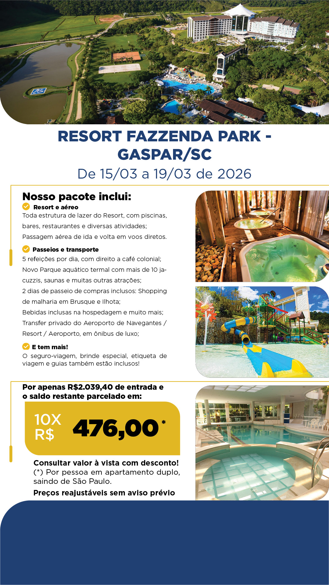 Nossa proposta é All Inclusive e contará com 5 refeições por dia, apartamentos prime (recém inaugurado no resort) e uma grande área de lazer proporcionada pelo Resort Fazzenda Park.