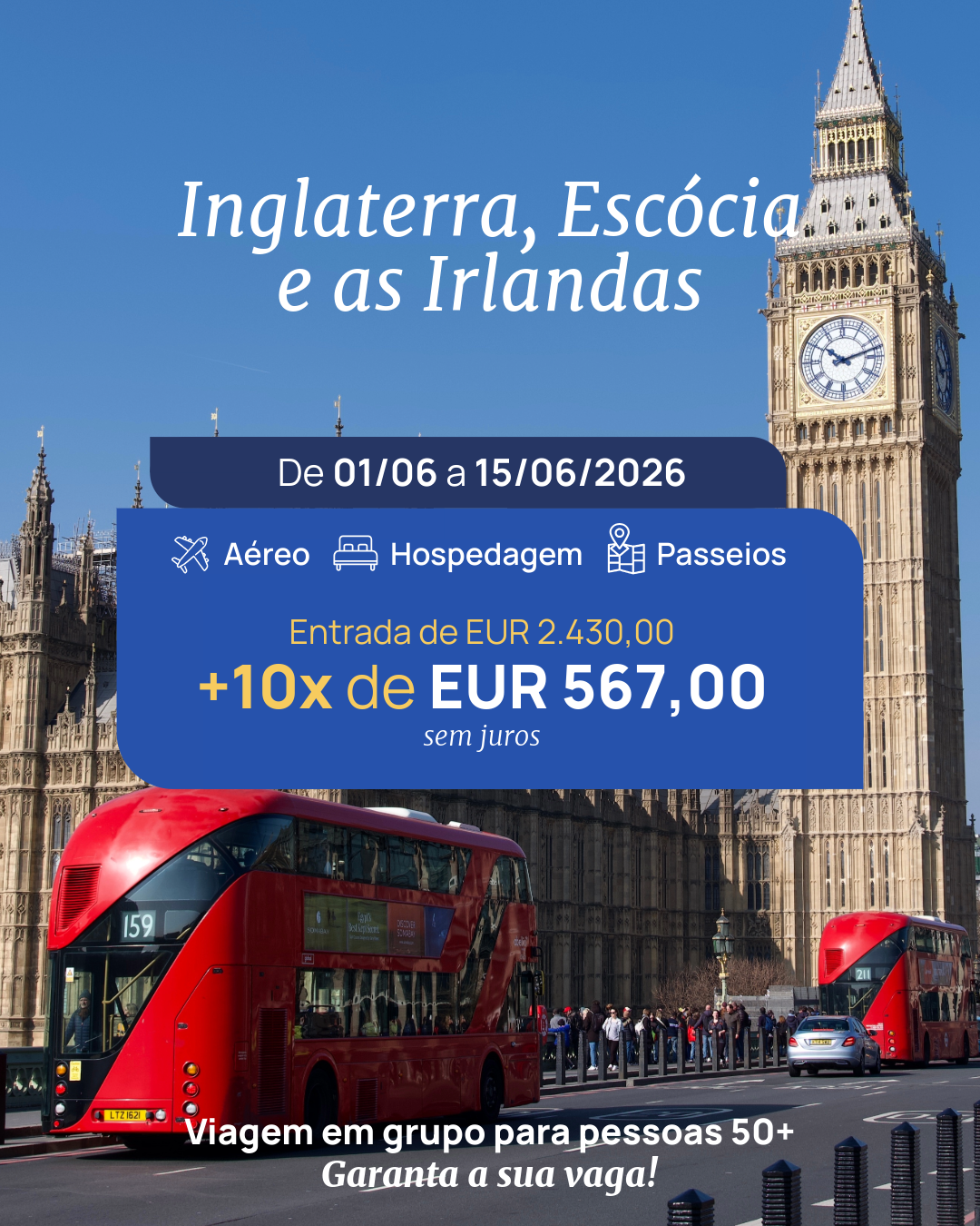 Serão 15 dias e 13 noites conhecendo as principais atrações de Inglaterra, Escócia, Irlanda do Norte e Irlanda, como: Londres, Windsor, Stonehenge, York, Cambridge, Edimburgo, Glasgow, Belfast e Dublin, com transporte incluso com ar-condicionado e com hotéis selecionados em regiões centrais, com café da manhã
