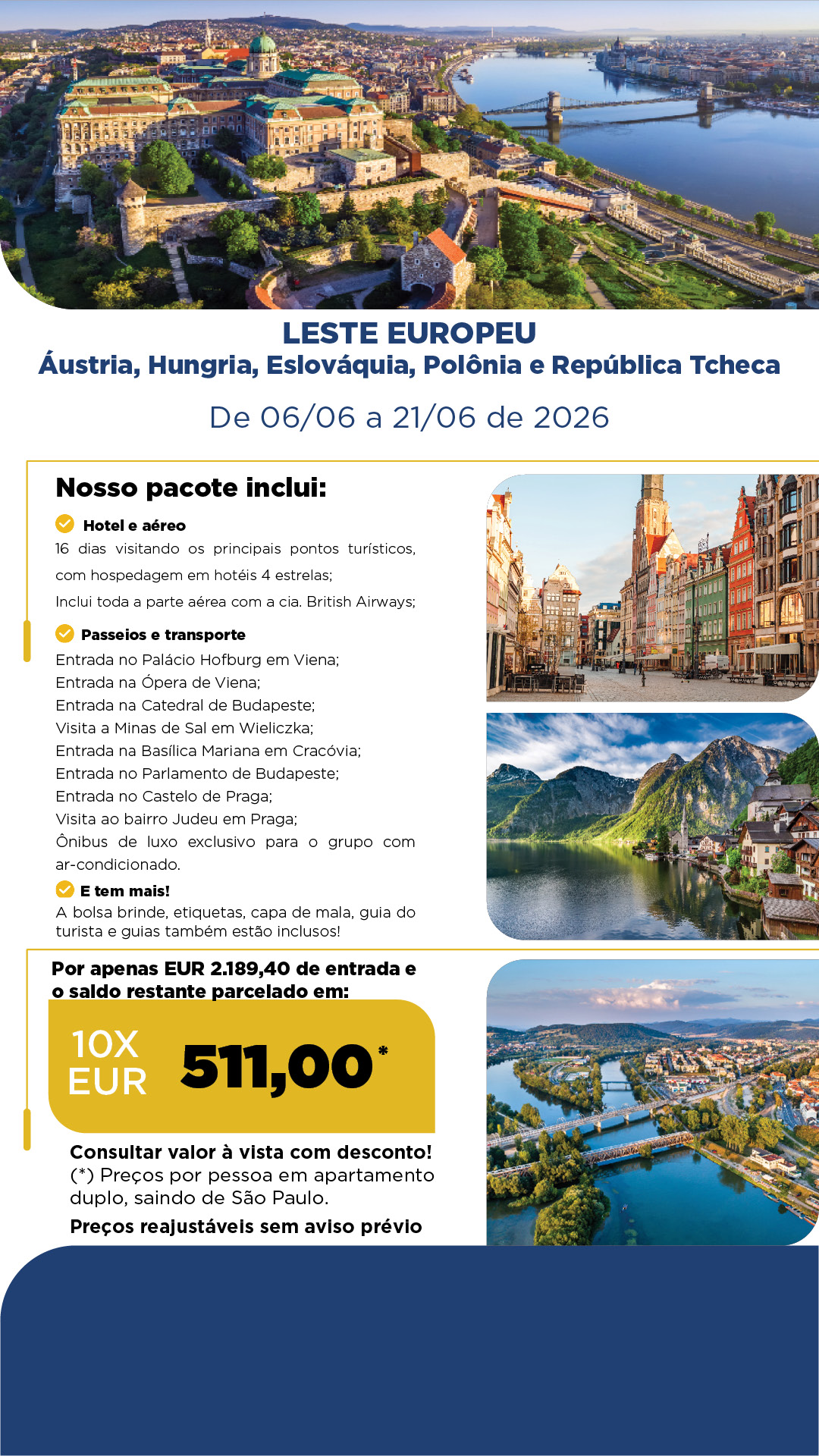 O Leste Europeu é uma região fascinante, onde castelos medievais, vilas charmosas e uma história encantadora se unem para revelar a alma autêntica da Europa, iremos visitar Áustria, Polônia, Hungria, República Tcheka e Eslováquia.