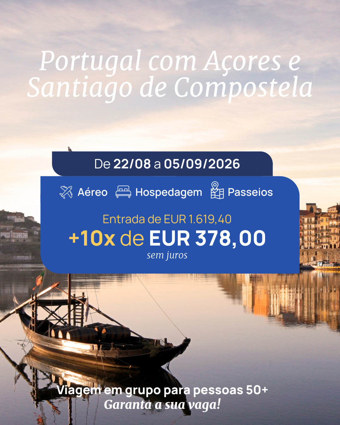 Como já é de costume, nosso pacote de viagem é completo! Conheceremos Portugal, através de uma viagem de 15 dias contará com passeios, guia local, transporte em ônibus luxo com ar-condicionado e muito mais já inclusos no pacote!